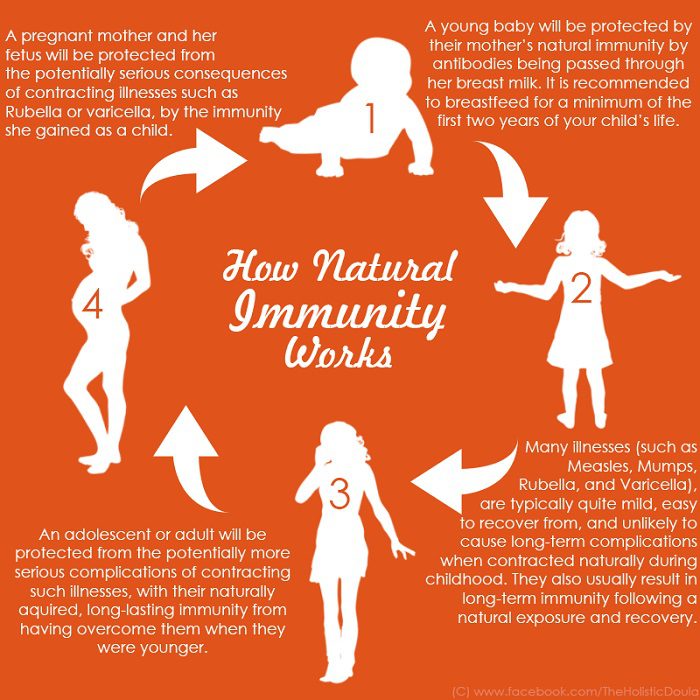 As depicted by the graphic below, natural immunity offers benefits to individuals and to a population across time and generations. Mothers who contract and recover from a childhood illness pass their immunity to their babies while in utero and through breastfeeding.