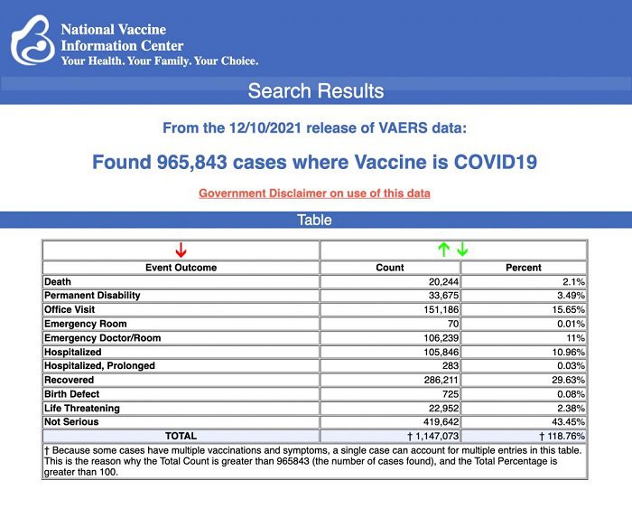 U.S. VAERS data from Dec. 14, 2020, to Dec. 10, 2021, for all age groups combined, show: