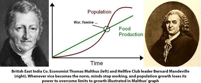 The constants among both apparent opponents (who remained friends throughout their lives) were that 1) neither believed that INTENTION or MIND should govern economic policy (Keynes believed in arbitrary “make work” which could not differentiate between the qualitative difference of a $100 paycheck to a digger of random holes vs $100 paycheck to an engineer building a dam), and 2) both believed equally in the universal validity of Malthus’s population theories, and of Bernard Mandeville’s satanic belief that personal vice creates public virtue. Both theories have underpinned British imperial grand strategy for over two centuries.