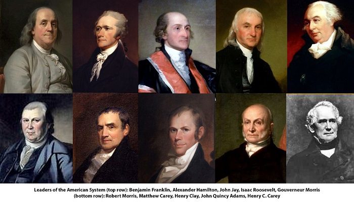 Some of Franklin’s leading protégé’s who carried this tradition into the 19th century included the first U.S. Treasury Secretary Alexander Hamilton (1755-1804), John Jay (1745-1829), Gouverneur Morris (1752-1816), Robert Morris (1734-1806), Isaac Roosevelt (1726-1794) (great-great grandfather to Franklin Roosevelt) and later Henry Clay (1777-1852), John Quincy Adams (1767-1848), Matthew Carey (1760-1839). Matthew Carey’s son Henry C. Carey (1793-1879) became a leading economic advisor to Abraham Lincoln.
