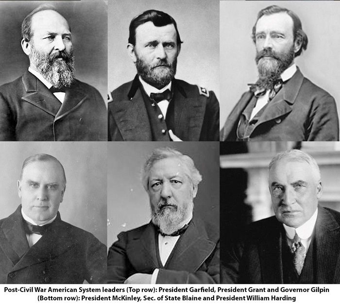 Between 1880-1930, this system was led by nationalist forces affiliated with President Garfield (1831-1881), President Ulysses Grant (1822-1885), Governor William Gilpin (1813-1894), President McKinley (1843-1901), Secretary of State James Blaine (1830-1893), and President Warren Harding (1865-1923). Each time it began to take hold the system was derailed by timely assassinations and it was only able to emerge once more in 1932.