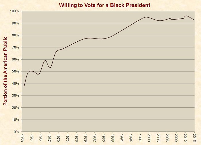 Furthermore, those same racial disparities and others worsened as racism declined dramatically. For instance, Gallup polls going back for more than half a century reveal that the portion of Americans willing to vote for a black president rose from 37% in 1958 to 95% by 1999: